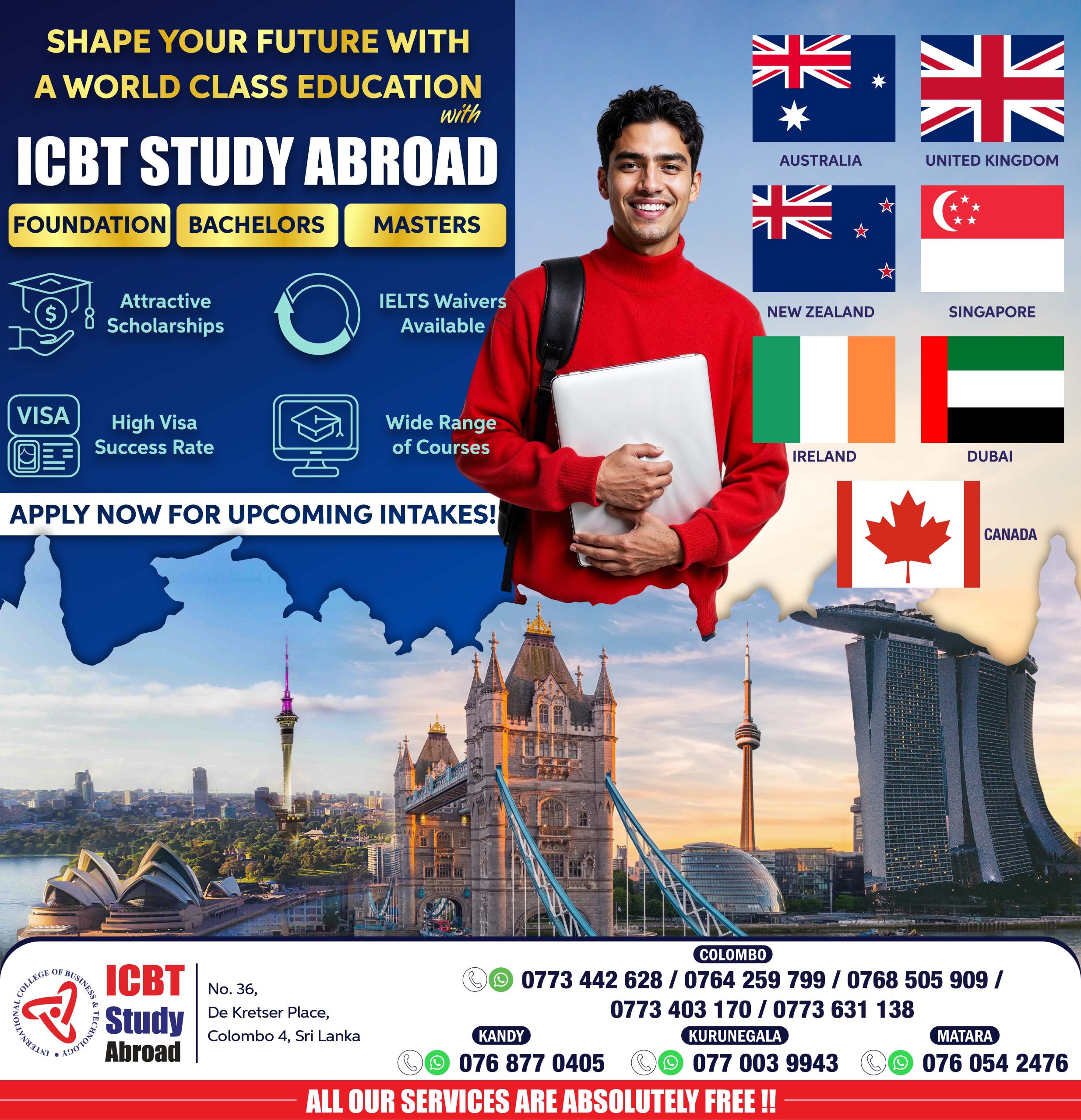 We are a unit of ICBT Campus to provide guidance, consultation and placement services to students for overseas. ICBT Study Abroad staff provides Professional and Quality advice to help you find the best option based on your academic and financial requirements. best study abroad programs. consultation and assistance for study in overseas. best study abroad service provider in sri lanka.